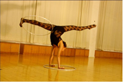“呼啦圈”,在呼啦圈表演中,雜技演員運用嫻熟的表演技巧,看似隨意地扭動著身體,一個又一個的呼啦圈在演員的腰間轉(zhuǎn)動起舞,優(yōu)美的舞姿讓人眼花繚亂。演員邊搖動身體,邊接受新增加的呼啦圈,上百個呼啦圈在速度的驅(qū)動下變化出各種姿態(tài),讓你感受曲線的柔美。
