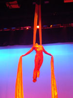 巴西組合表演節(jié)目(一):“綢吊”,它的表現(xiàn)形式,將表演道具“綢吊”在寬度和色彩上加以夸張,并將一般垂直“綢吊”的表演形式改革創(chuàng)新為快速飛旋的高空表演,在編排創(chuàng)意上以人類永恒的“情愛”立意,表現(xiàn)了人類對美好愛情的向往追求。其充滿浪漫情懷的藝術(shù)表現(xiàn)就給現(xiàn)場觀眾帶來了強烈的震撼。