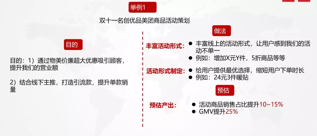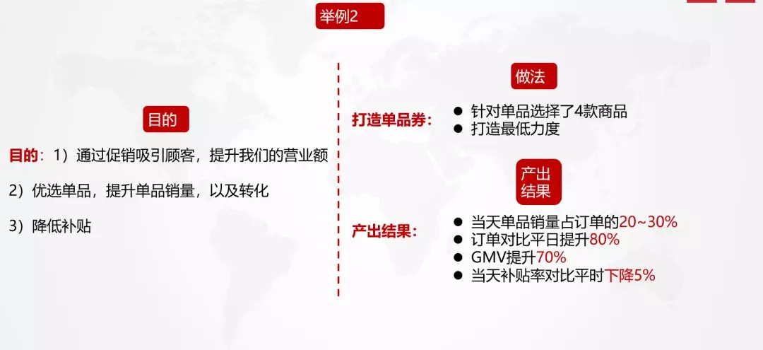 第二個例子是曾經(jīng)在某O2O平臺工作時的活動策劃,其中活動策劃目的對比舉例一增加了降低平臺補貼率,活動形式上,除了常規(guī)的商品活動以外,這次還額外增加了單品券的活動形式。