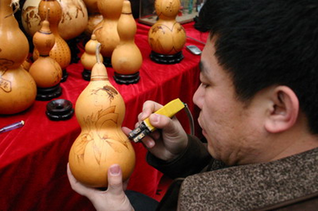 葫蘆烙畫藝術(shù)又稱燙畫,火筆畫,即藝術(shù)家用電烙鐵在物體上熨出烙痕作畫,與葫蘆融為一體能永久保存、收藏,藝術(shù)價值極高。烙畫創(chuàng)作在把握火候、力度的同時,注重“意在筆先、落筆成形”。烙畫不僅有中國畫的勾、勒、點、染、擦、白描等手法,還可以熨出豐富的層次與色調(diào),具有較強(qiáng)的立體感,酷似棕色素描和石版畫,因此烙畫既能保持中國傳統(tǒng)繪畫的民族風(fēng)格,又可達(dá)到西洋畫嚴(yán)謹(jǐn)?shù)膶憣嵭Ч?。也可訂做屬于自己的特有畫面或肖像,使其有獨特的藝術(shù)魅力,因而給人以古樸典雅、回味無窮的藝術(shù)享受。