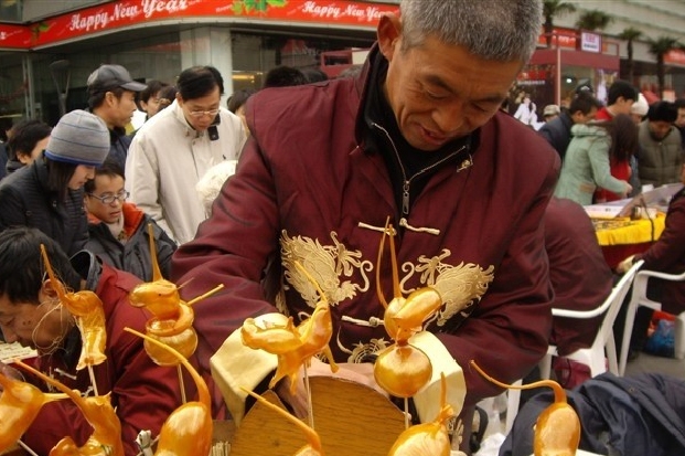 吹糖人是吹糖稀作人形,可供兒童食用或玩賞。以其制作簡(jiǎn)單,常用以比喻作事容易。吹糖人的是舊京一個(gè)行業(yè),小販們肩挑挑子走街串巷,挑子一頭是一個(gè)帶架的長(zhǎng)方柜,柜子下面有一半圓形開口木圓籠,里面有一個(gè)小炭爐,爐上有一個(gè)大勺,中間放滿了糖稀(據(jù)說(shuō)是麥芽糖溶化所得)。